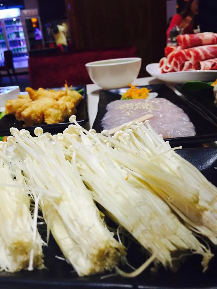 We opted for the two different soups, spicy and non-spicy. I like the taste of both but prefer the non-spicy one, while hubby liked the spicy one better. Our ordered meats and vegetables came out promptly and we were happily cooking our meals in the hotpot. I've tried to separate our meats equally, but I was so sure that hubby put more meats in the spicy soup...