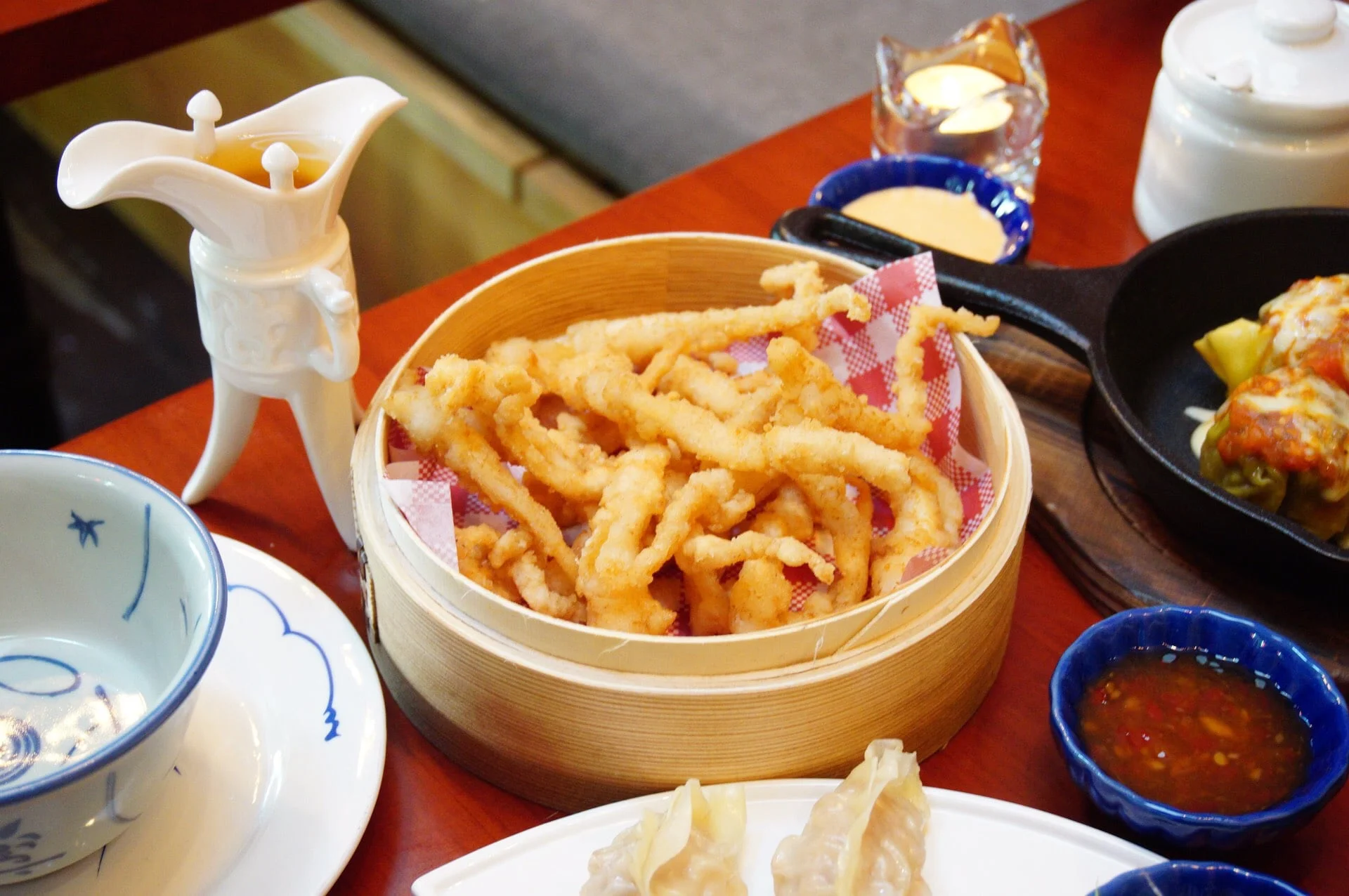 I left Erlin and hubby to take a look at the menu while I wondered around the premise. The back area was bigger than the front, a bit darker and the huge long wall was decorated with bamboo steamers of different sizes. The long tables really mixed well with the light brown bamboo colour and there was also a staircase leading to the second floor. Hugo explained that they were still in the middle of refurbishing the second floor. In the future they’re planning to have tea degustation course where each dish will be paired with different Chinese tea. I was so excited when I heard that and will definitely be interested in trying it out. There was a small outdoor area decorated with colourful hanging lanterns and fake grass to cover the brick wall. It’ll be a good area to eat at during the day especially when it wasn’t too scorching hot.